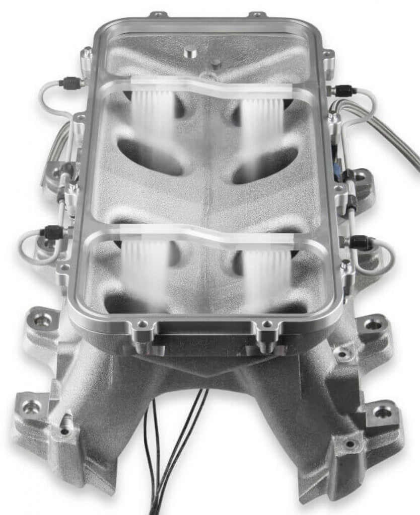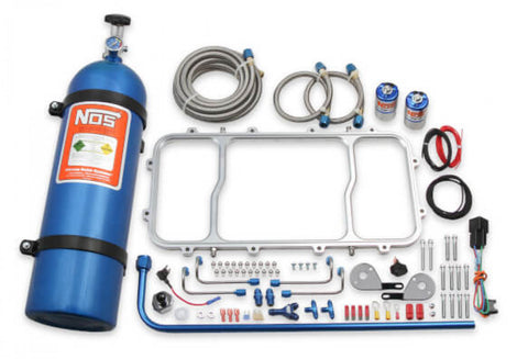 NOS NOS sandwich-style plate systems are designed to bolt between the upper and lower intake sections on Holley Hi-Ram LS manifolds. Our dry nitrous systems give you everything you need including 2 NOS Pro-Race nitrous solenoids, brackets, hoses, jetting, and hardware, along with your choice of nitrous bottle. At the center of this system is our machined billet 6061-T6 aluminum plate laser engraved with NOS logo, then anodized for great looks and excellent corrosion protection. Our 1-piece plate features machined passages that precisely spray into the center of each cylinder. Plate includes jetting for up to 250 horsepower but is capable of supporting 1000+ horsepower. The plate is made from billet aluminum with passages machined directly into the plate so there is no need to worry about spray bars breaking or spinning.