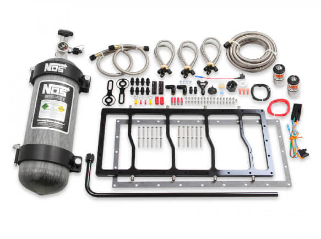 NOS NOS sandwich-style plate systems are designed to bolt between the upper and lower intake sections on LS-equipped Sniper EFI Race Series Intake Manifolds. Our dry nitrous systems give you everything you need including 2 NOS Pro-Race nitrous solenoids, brackets, hoses, jetting, and hardware, along with your choice of nitrous bottle. At the center of this system is our machined billet 6061-T6 aluminum plate laser engraved with NOS logo, then anodized for great looks and excellent corrosion protection. Our 1-piece plate features machined passages that precisely spray into the center of each cylinder. Plate includes jetting for up to 250 horsepower but is capable of supporting 1000+ horsepower. The plate is made from billet aluminum with passages machined directly into the plate so there is no need to worry about spray bars breaking or spinning.