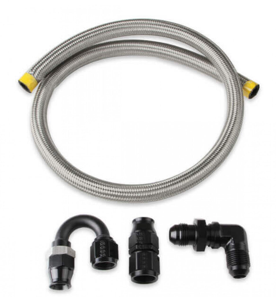 NOS These NOS blowdown hose kits are available with 90 or 180 degree bottle fittings and straight or 90 degree exit fitting offering you many fitment choices. Also included is a 36 inch length of stainless steel braided Speed-Seal hose and a choice of black Speed-Flex fittings. This type of hose kit is necessary when mounting a nitrous bottle inside the passenger compartment or trunk of a vehicle. It directs the nitrous outside of the vehicle in the case of an over-pressurization event.