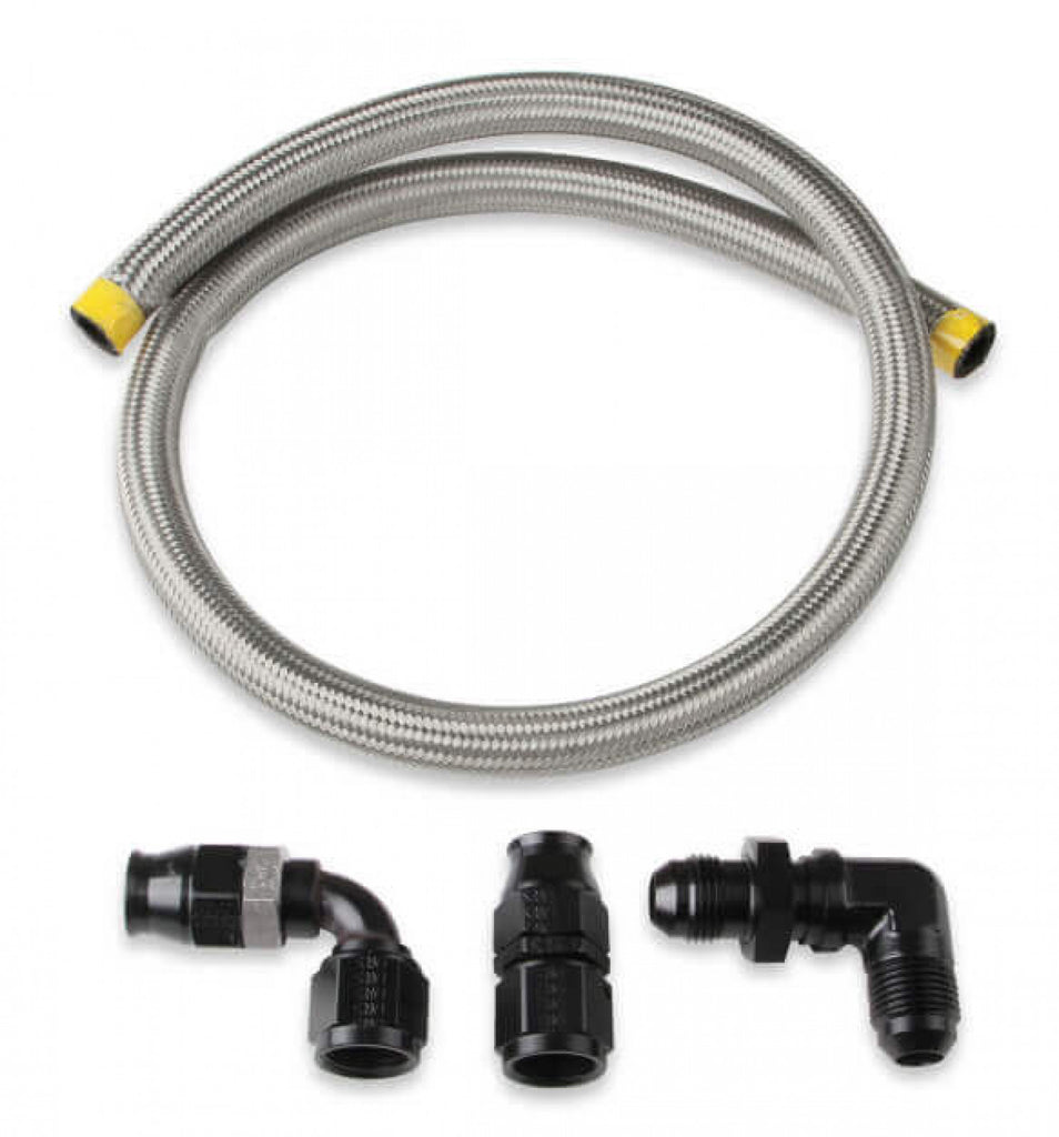 NOS These NOS blowdown hose kits are available with 90 or 180 degree bottle fittings and straight or 90 degree exit fitting offering you many fitment choices. Also included is a 36 inch length of stainless steel braided Speed-Seal hose and a choice of black Speed-Flex fittings. This type of hose kit is necessary when mounting a nitrous bottle inside the passenger compartment or trunk of a vehicle. It directs the nitrous outside of the vehicle in the case of an over-pressurization event.