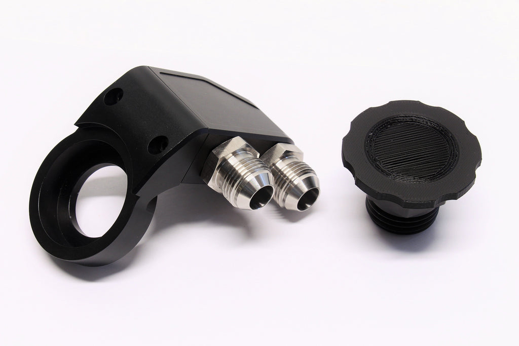 This Precision Works oil cap is the easiest way to add 10AN fittings to your valve cover, 100% bolt-on with no cutting or welding. Pair this with our PLM oil catch can & hose kit for a complete installation kit!