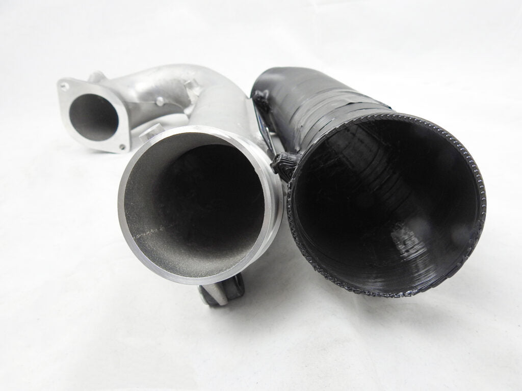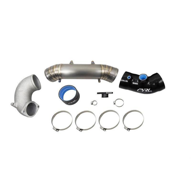 The PRL Motorsports Turbocharger Inlet Pipe Kit is a direct bolt-on upgrade that eliminates airflow restriction before the turbocharger, allowing the turbocharger to operate more efficiently. Our design utilizes a cast aluminum inlet piece to allow smooth transition from the gasket-matched 64mm ID compressor inlet to a 80mm OD / 78mm ID oulet throughout the Titanium crossover pipe. This kit the largest inlet pipe available and offers over a 50% increase in airflow volume in comparison to the factory inlet pipe!
