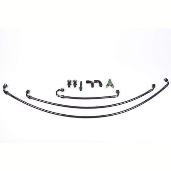 The dual pump plumbing kits include plug n' play adapter fittings for the fuel pump outlet, FPR return inlet, and crossover hose underneath the rear seats. It reuses the OEM hard lines.