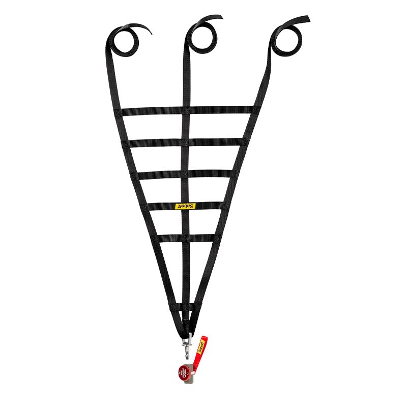 Professional window net. Triangular assembly, suitable for left and right windows. 1” webbing. Top version push button adjustable buckle (3/4”-16 UNF thread.) Optional 2” front strap (see variations.)
