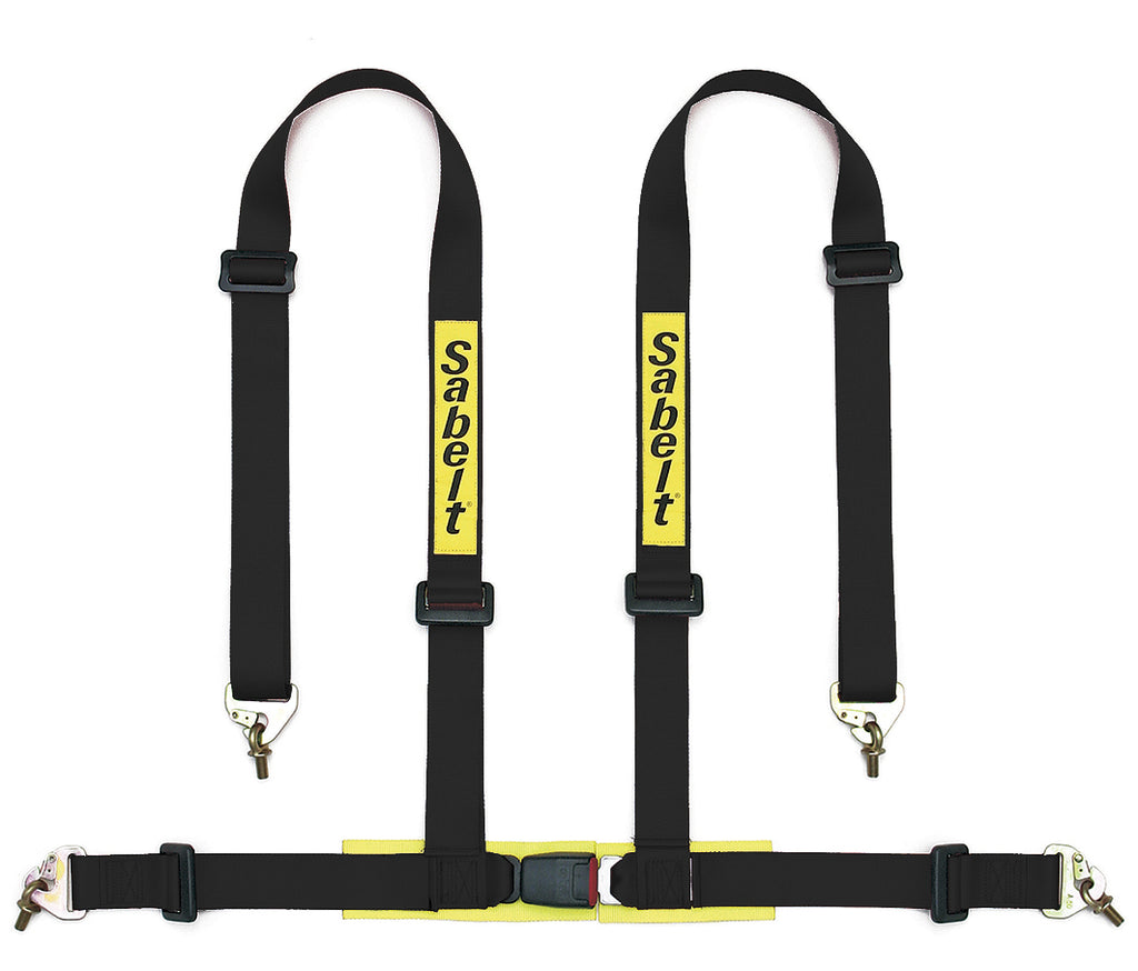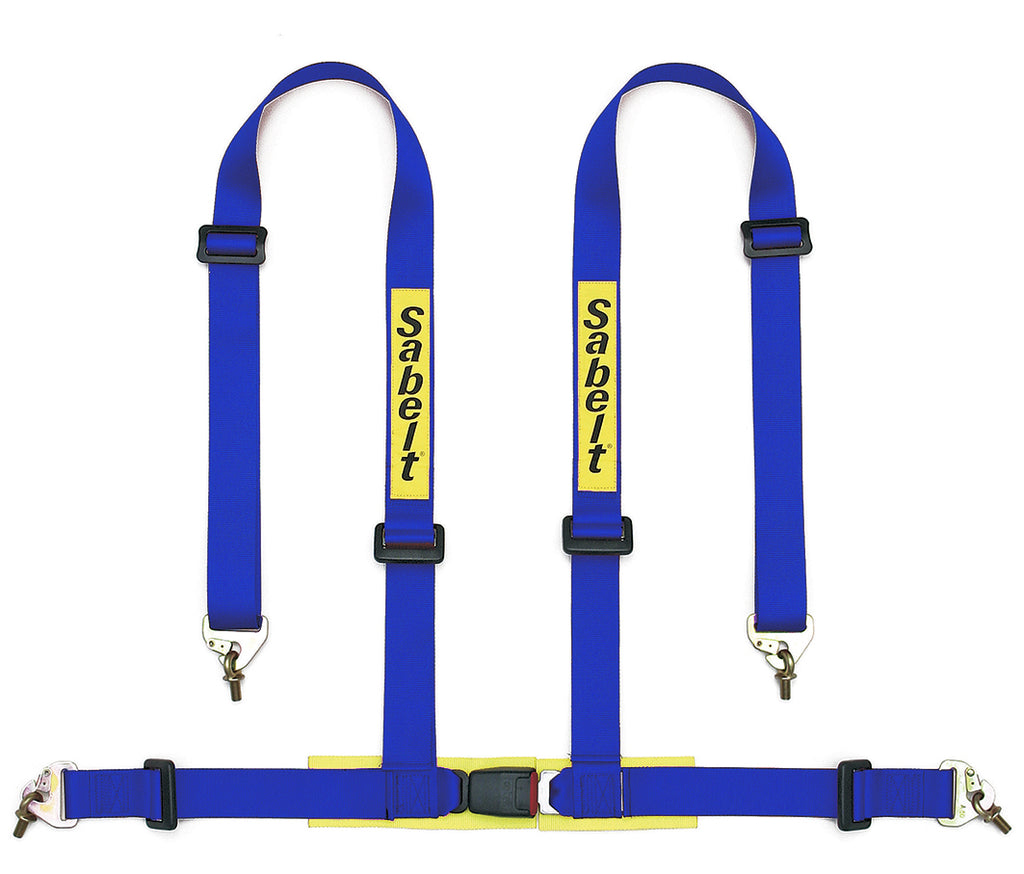 The Sabelt Clubman Saloon 4-Point harness features dual 2″ shoulder straps that each have a snap-in end plate installed with a 3-bar slider for easy conversion to wrap-around mounting. The other end of each shoulder strap is sewn to the lap belt, one on either side of the push button release buckle. The 2″ lap belts have pull-up length adjusters and snap-hook end plates sewn in. A 3″ wide spreader pad is sewn to the right side lap belt behind the buckle. Includes 4 eyebolts (7/16-20 thread) and a pair of matching 2″ harness pads for the shoulder straps. Available in red, black, or blue.