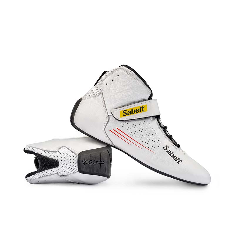 The Sabelt Hero TB-9 is a true professionals mid-cut racing shoe with an ultra-thin calf leather exterior and a Nomex fire-retardant interior. The easy velcro closure is smartly positioned low across the shoe to allow for plenty of mobility in the ankle. The back portion features a stretch panel, providing extra flexibility and comfort. The tongue and sides of the shoe are perforated for exceptional ventilation, and the toe of the shoe is reinforced for strength. The minimal three line design and Sabelt logos are screen-printed, keeping the shoe as lightweight as possible. The patented ultra-thin sole has a minimalist tread for unmatched pedal feel and feedback.