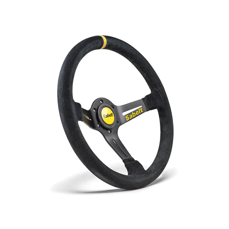 Sabelt SW-465 steering wheel, originally called the Sabelt RAC steering wheel. A very traditional, semi dished 3 spoke, race and rally car steering wheel with a 350mm diameter. Finished in black suede and supplied complete with horn push button. Sabelt steering wheels feature stronger aluminium spokes than their competitors and a round handgrip section of 30mm diameter, with a 65mm depth dish.