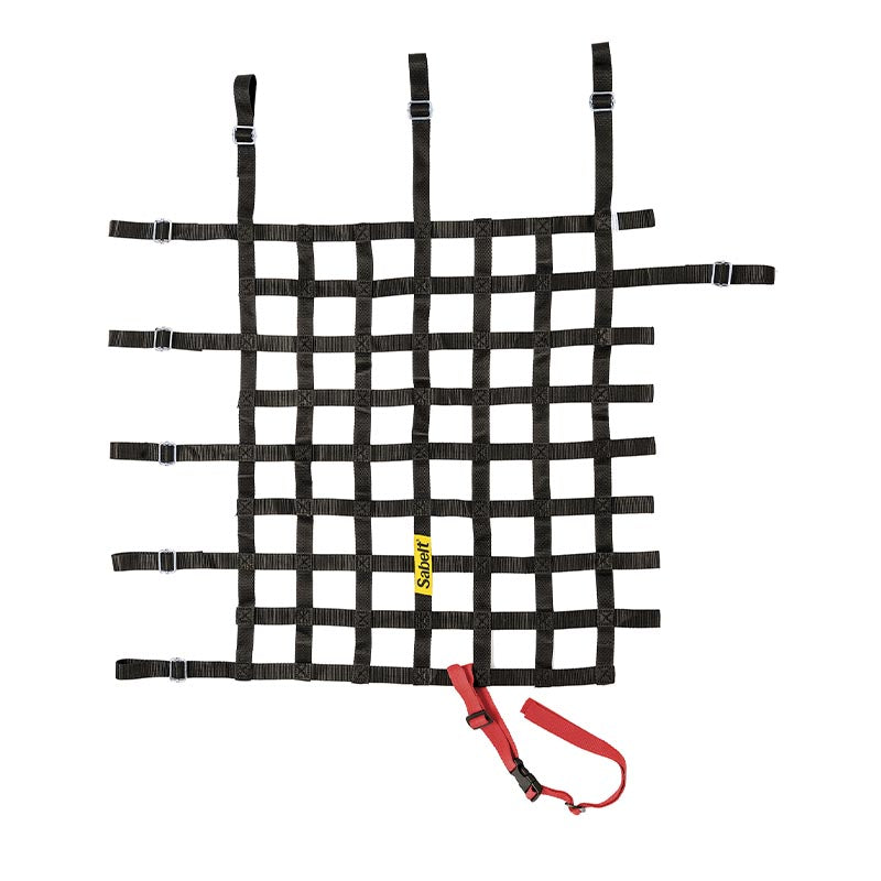 Professional window net. Red webbing opening system. Roll cage mounting. Tightening adjusters. Polyester webbing. In compliance with FiA regulation.