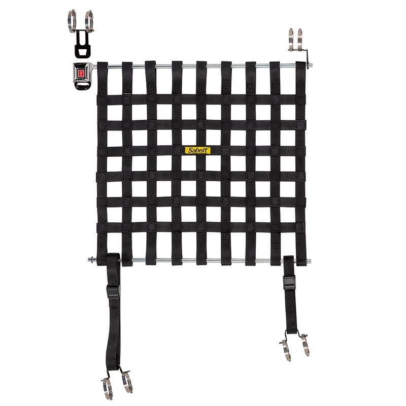 Professional window net. Quick release with push button. Roll cage fixing clamps. Tightening adjusters. Rigid metal bars. Polyester webbing. In compliance with FiA regulation.