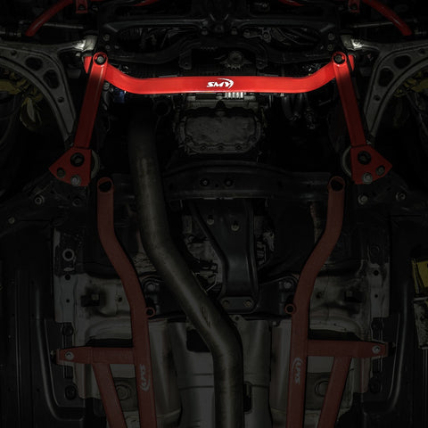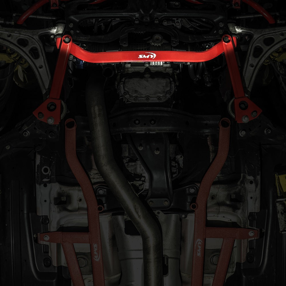 The SMY front lower arm power brace bar installs underneath the transmission and will brace both control arms and help add more reinforcement and improve steering response and handling.