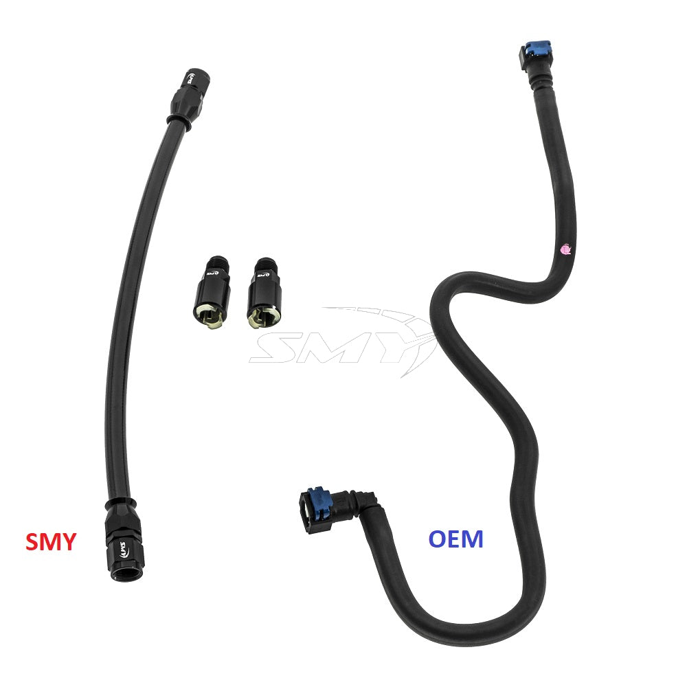 Clean up your engine bay with this simple to install fuel line hose upgrade. This kit replaces the awkward OEM fuel feed tube going from the hard line on the firewall to the engine. The hose material is nylon and stainless steel braided over a synthetic rubber hose pre assembled with high quality black AN aluminum fittings.