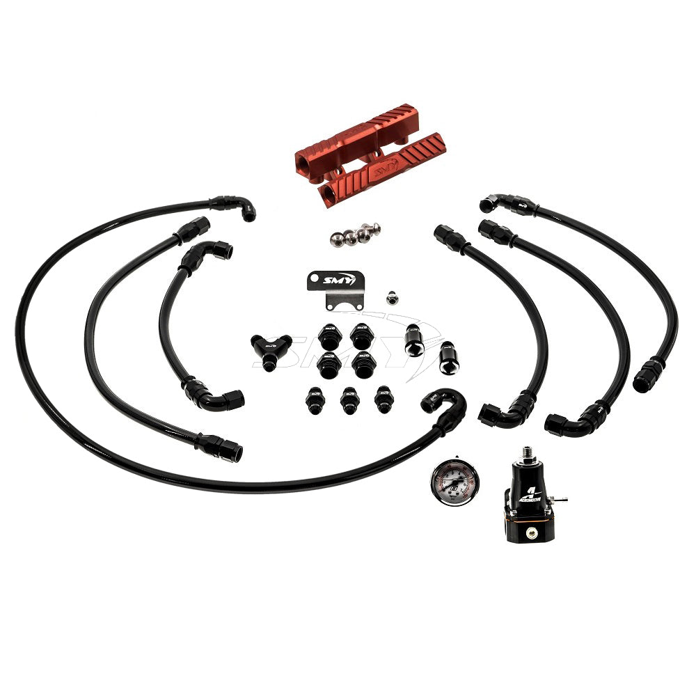 The SMY fuel line kit shown here is perfect for anyone looking to upgrade their OEM fueling setup. This kit will support up to 1000 hp. Our fuel lines are not the simple cheap rubber hoses with a nice jacket as supplied on many other kits. OurPTFE fuel lines are reinforced with braided stainless steel, then to make it pretty they are wrapped in a black nylon braided jacket. We also include all high-end AN fittings, even to the hard lines. This kit will remove the OEM fuel pressure regulators and replace them with an aftermarket fuel pressure regulator.