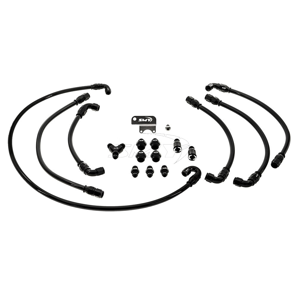 The SMY fuel line kit shown here is perfect for anyone looking to upgrade their OEM fueling setup. This kit will support up to 1000 hp. Our fuel lines are not the simple cheap rubber hoses with a nice jacket as supplied on many other kits. OurPTFE fuel lines are reinforced with braided stainless steel, then to make it pretty they are wrapped in a gloss black PVC Coated jacket. We also include all high-end AN fittings, even to the hard lines. This kit will remove the OEM fuel pressure regulators and replace them with an aftermarket fuel pressure regulator.