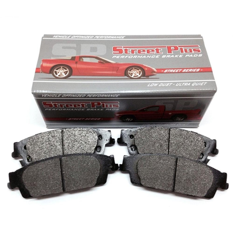 Street Plus™ HP Semi-Metallic Brake Pads by SP Performance®. Vehicle Specific, "low resin" formulation, is manufactured with a "Positive Mold" process insuring strength, quality, and performance. The OE style Chamfering and slotting help heat and dust dissipation. This advanced low dust formula provides excellent durability, quick recovery, and is rotor friendly compared to conventional brake pads. These semi-metallic high-performance brake pads are formulated for aggressive street driving, smooth quiet stopping, and will also keep your wheels clean. Street Plus brake pads have proven themselves in all types of weather conditions to stop better and last longer than traditional brake pads. Available for cars, trucks, and SUV's.