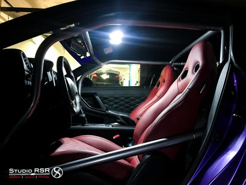 Designed and manufactured in-house, StudioRSR uses the latest manufacturing technologies to create this upgrade with **NASA Racing specifications** and wide-radius bends. There is zero metal crimping and zero tubing wall failure that is often seen from alternative roll cages. The Aractnid roll cage is 100% bolt-in featuring optimum mounting designs with form-fitted brackets specific to the R35 chassis. Professional installation is recommended, but installation is made easy with chromoly interlocking tubing clamps, zero welding, and all necessary hardware included. Additionally, street-spec classed vehicles can retain their rear seats if preferred. Available in-house at StudioRSR or shipped direct to you or your preferred Dealer/Installer internationally. The Aractnid half-cage consists of 2 main pieces making installation and shipping even easier.