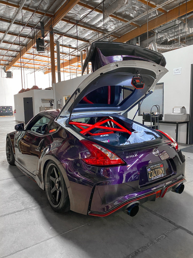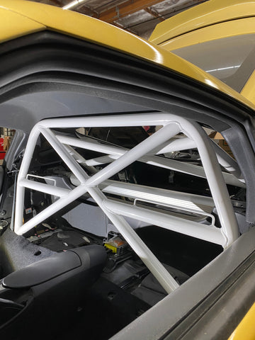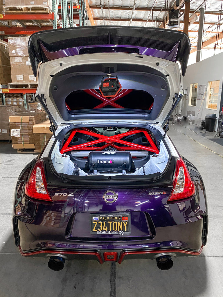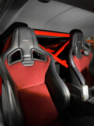 Designed and manufactured in-house, StudioRSR uses the latest manufacturing technologies to create this upgrade with **NASA Racing specifications** and wide-radius bends. There is zero metal crimping and zero tubing wall failure that is often seen from alternative roll cages. The Binarium half-cage is 100% bolt-in featuring a 4-point optimum mounting design with form-fitted brackets specific to the Z34 chassis. Professional installation is recommended, but installation is made easy with chromoly interlocking tubing clamps, zero welding, and all necessary hardware included. Additionally, street-spec classed vehicles can retain their rear seats if preferred. Available in-house at StudioRSR or shipped direct to you or your preferred Dealer/Installer internationally. The Z34 half-cage consists of 2 main pieces making installation and shipping even easier.