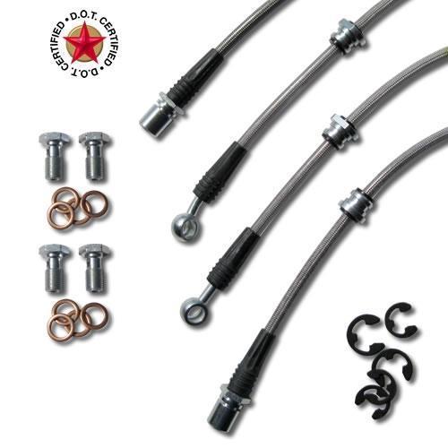 Overtime and under continuous use, OEM rubber lines can swell and expand, exposing the driver to brake fade. The rubber cover is also vulnerable to attacks from the ozone layer rubber which causes it to deteriorate. In extreme applications (Auto X, racing, hard driving) rubber hoses might be susceptible to flying debris. Stainless steel lines will give protection from theses issues along with enhancing the appearance of your installation.