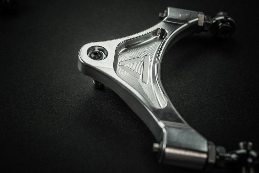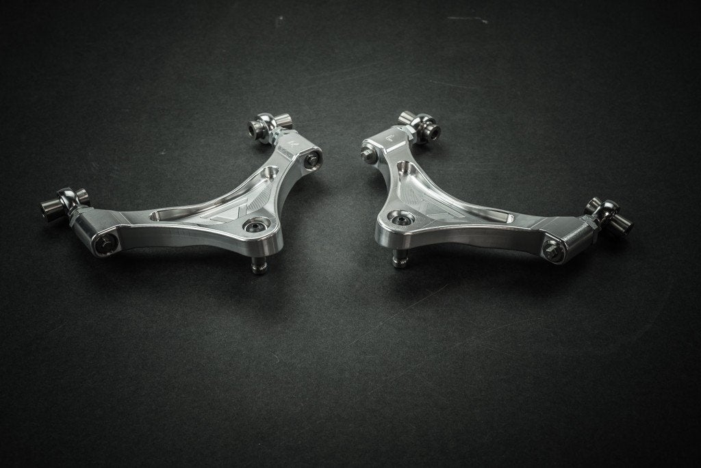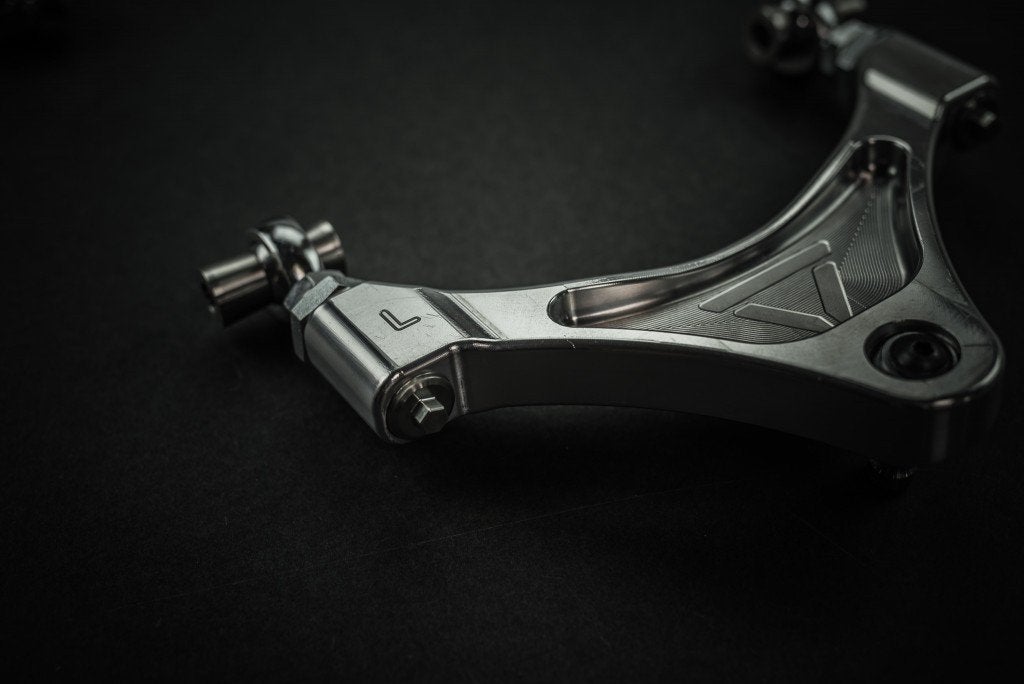 Voodoo13 dual adjustable front upper control arms for the Nissan 370Z and Infiniti G37 are made from CNC milled aerospace grade 6061 aluminum, sporting not only dual adjustment functionality, but also an innovative impressive design. The slim upper spindle mount helps prevent upper control arm slap from excessively lowered cars, while utilizing an encased spherical bearing design that prevents deformation from impact or high driving forces over time. The easy to reach dual adjusters allow for both caster and camber correction, all while never being unbolted from the car, to suite any application.