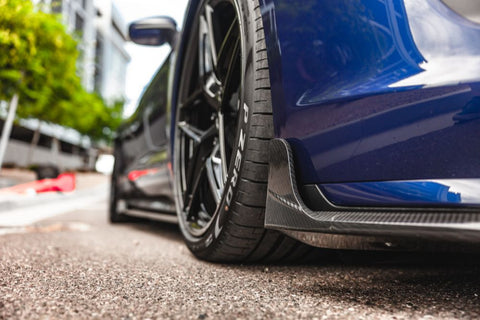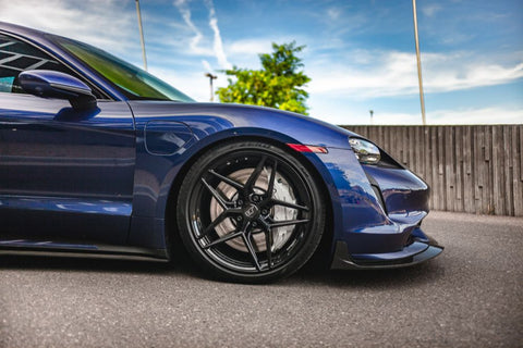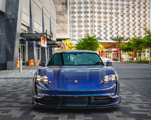 The Porsche Taycan front end really shows off the latest in Porsche styling. As an automotive first for Porsche, the electric vehicle has Porsche performance and style exuding from its soul. Enhancing the electric vehicle is limited but it can certainly be done in the styling department. Vivid Racing's VR Aero brand has created one of the most amazing looking aero kits for the Porsche Taycan. Part of the aero kit components is this front lip spoiler. The lip spoiler is designed to flow with the body lines while giving that extra aggressiveness to the front end. While following the front bumper lines, we had added extra flare on the side of the bumper before the wheel arch. This design element carries on with the our side skirts as well. The front lip spoiler is full carbon fiber, manufactured from pre-preg material. Pre-preg has that glossy finish but does not require layers of clear coat to be applied after vacuum bagging. With this process, the quality and finish is simply the best! The lip spoiler attaches to the front end using both strong double sided adhesive tape as well as mounting with self tapping screws. If you are wanting to dress your Porsche Taycan up, these carbon fiber aero parts from Vivid Racing are the answer.